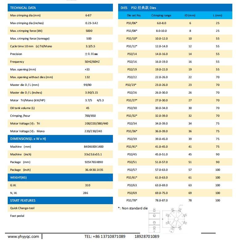 The P32 Classic model is engineered for precision and reliability, featuring a Parker solenoid valve, Siemens motor, and an imported hydraulic pump, all fine-tuned by a renowned US brand. With a high-precision hydraulic cylinder, it is designed to handle applications ranging from 6 to 51 and supports a maximum crimp size of 2-inch four-layer steel wire hydraulic hose. Its intuitive operation and superior accuracy make it the perfect choice for factories and pressure pipe stores, ensuring seamless, high-quality results.