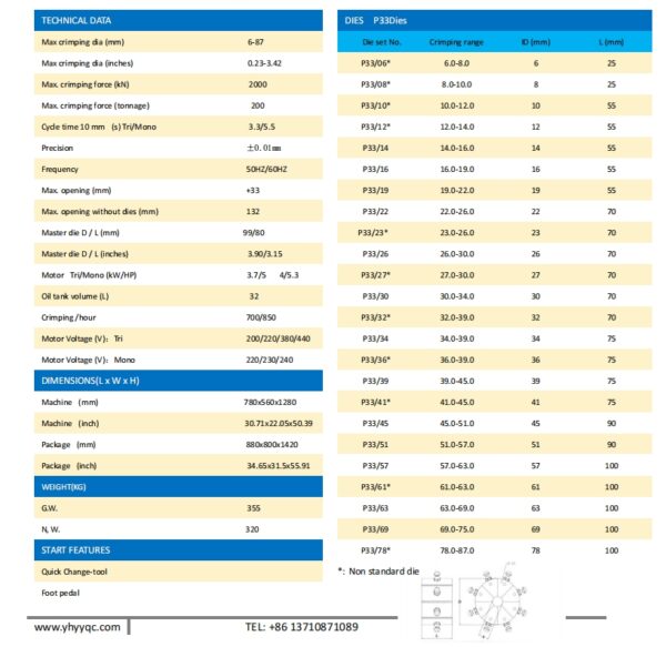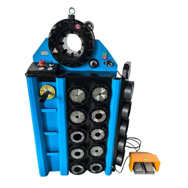 The P33 model is built for superior performance, combining a Parker solenoid valve, Siemens motor, and an imported hydraulic pump, all expertly calibrated by a leading US brand. It features a high-precision hydraulic cylinder, suitable for a range of 6-51, with a maximum crimp size of 2-inch four-layer steel wire hose. With its user-friendly operation and exceptional accuracy, it’s the ideal choice for factories and pressure pipe shops seeking reliable, consistent results.